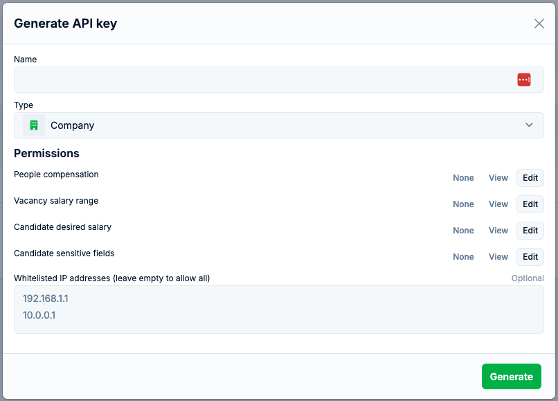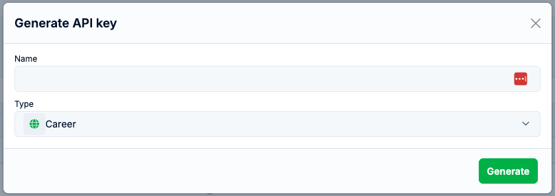 - Career API key - can be used to display vacancies on your public website. These API keys can be used on a public-facing website.