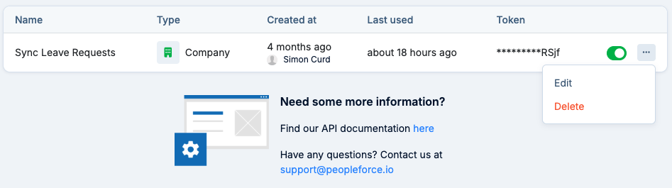 - Company API key - provides full access to the PeopleForce API and employee data with minimal restrictions.