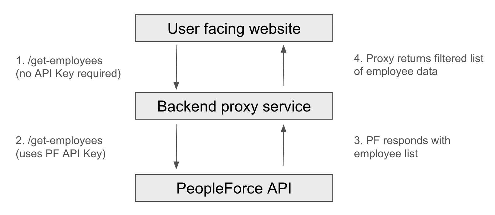 Step 2: The backend proxy service receives this request, and in turn will call PeopleForce to retrieve a list of employees, potentially filtered based on the use case. It will also know the PeopleForce API Key and use this in the background to retrieve the employee list